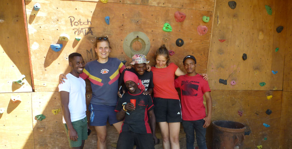 Gemeinsam mit vielen Freiwilligen und Projektleitenden wird die Boulderwand eine Woche vor Ende unseres weltwärts-Jahres feierlich eröffnet. Die Anlage ist nun ein offizieller Teil des Thakaneng Child & Youth Care Centres in Ikageng. Noch gibt es nur wenige Routen und kein fest etabliertes Training. Das Dach, das die Wand vor Wind und Wetter schützt, folgt wenige Tage später.